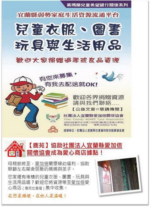 鹿苑為社團法人宜蘭縣愛加倍關懷協會的 愛心商店 據點,協助收集各界物資提供弱勢家庭使用!